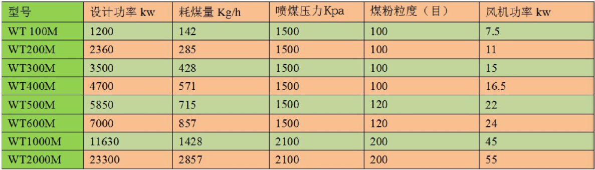 燃煤燃燒器型號(hào)及技術(shù)參數(shù):